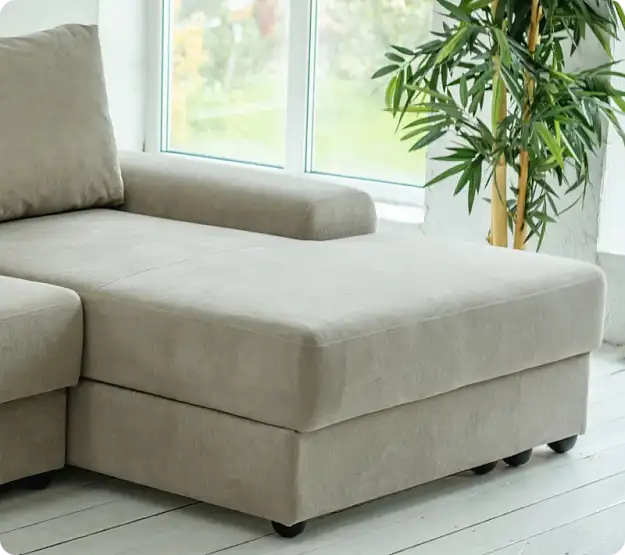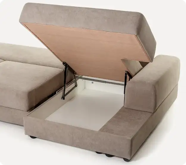 Диван с подлокотником (левый или правый)То же, что и средний диван, но с подлокотником с одной стороны. Внутри — механизм трансформации пантограф и ящик для белья. Можно использовать как отдельный диван для маленькой комнаты или как крайний модуль в большой конструкции.